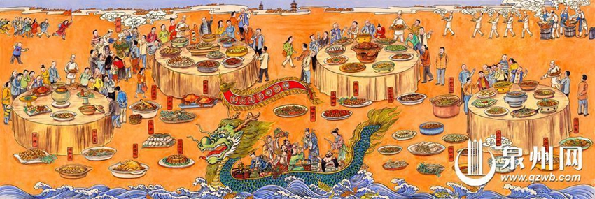 "This artwork is tailor-made for Quanzhou's bid to become a 'City of Gastronomy.' In terms of artistic technique, I've combined the traditional Chinese long scroll style with vibrant color painting, creating a visual language that reflects Quanzhou's innovative food culture, drawing inspiration from the past while embracing the present," Hong Zhixiong explained. "Within the piece, I've included five 'Afu' (Fortune) figures, symbolizing 'blessings coming to the door,' a traditional auspicious motif. Additionally, the Eight Immortals are depicted rushing to Quanzhou's gastronomic scene aboard a dragon boat, symbolizing the theme of 'Eight Immortals crossing the sea, eager to savor the fragrant offerings of ancient Quanzhou.'"